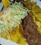 Deliciosos plátanos maduros fritos, con carne asada y ensaladita.
