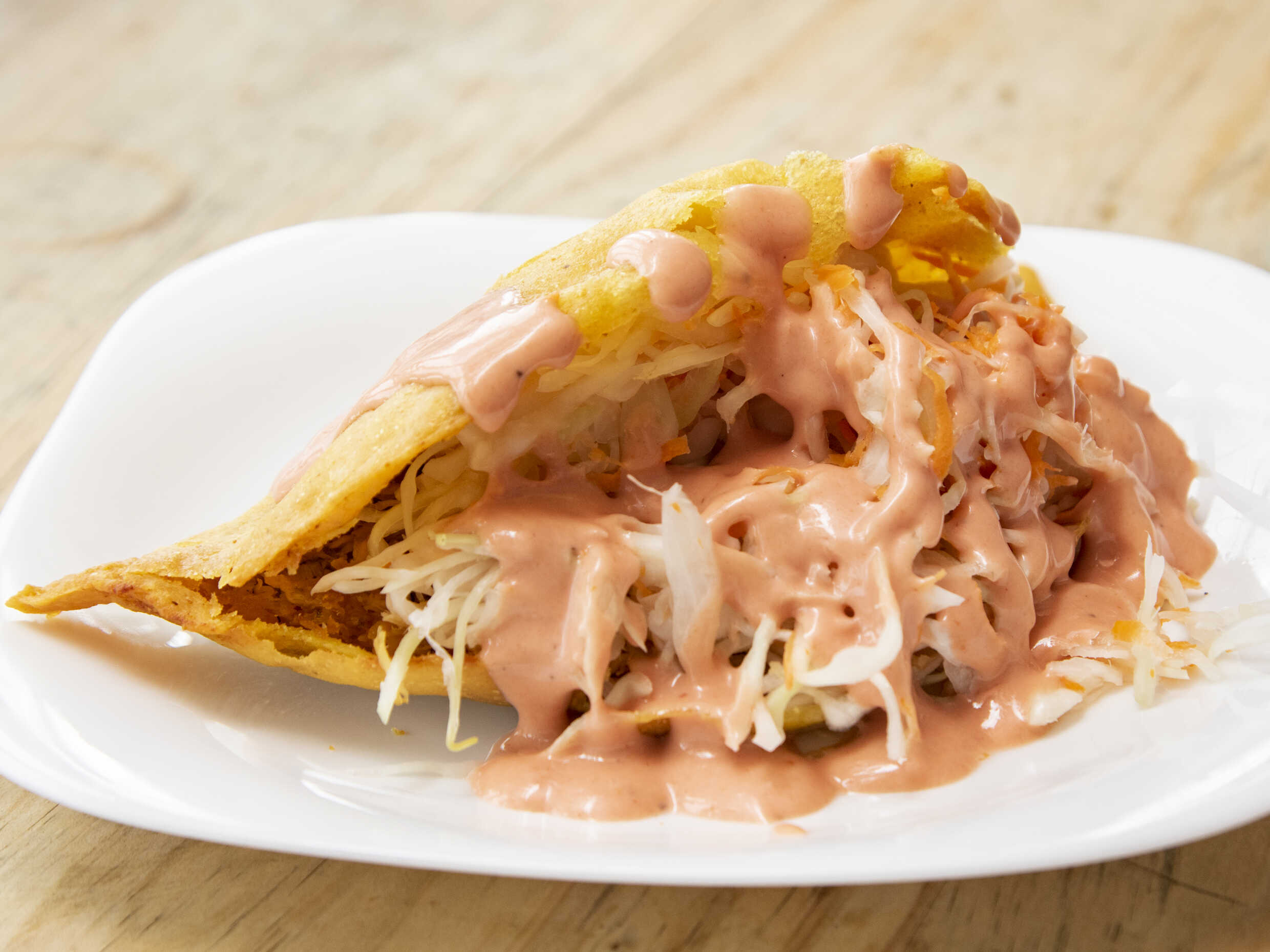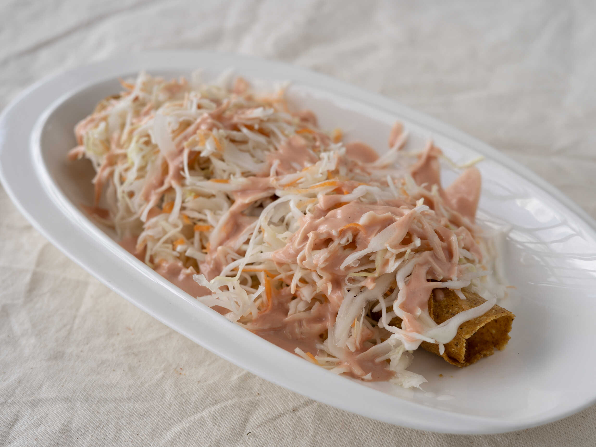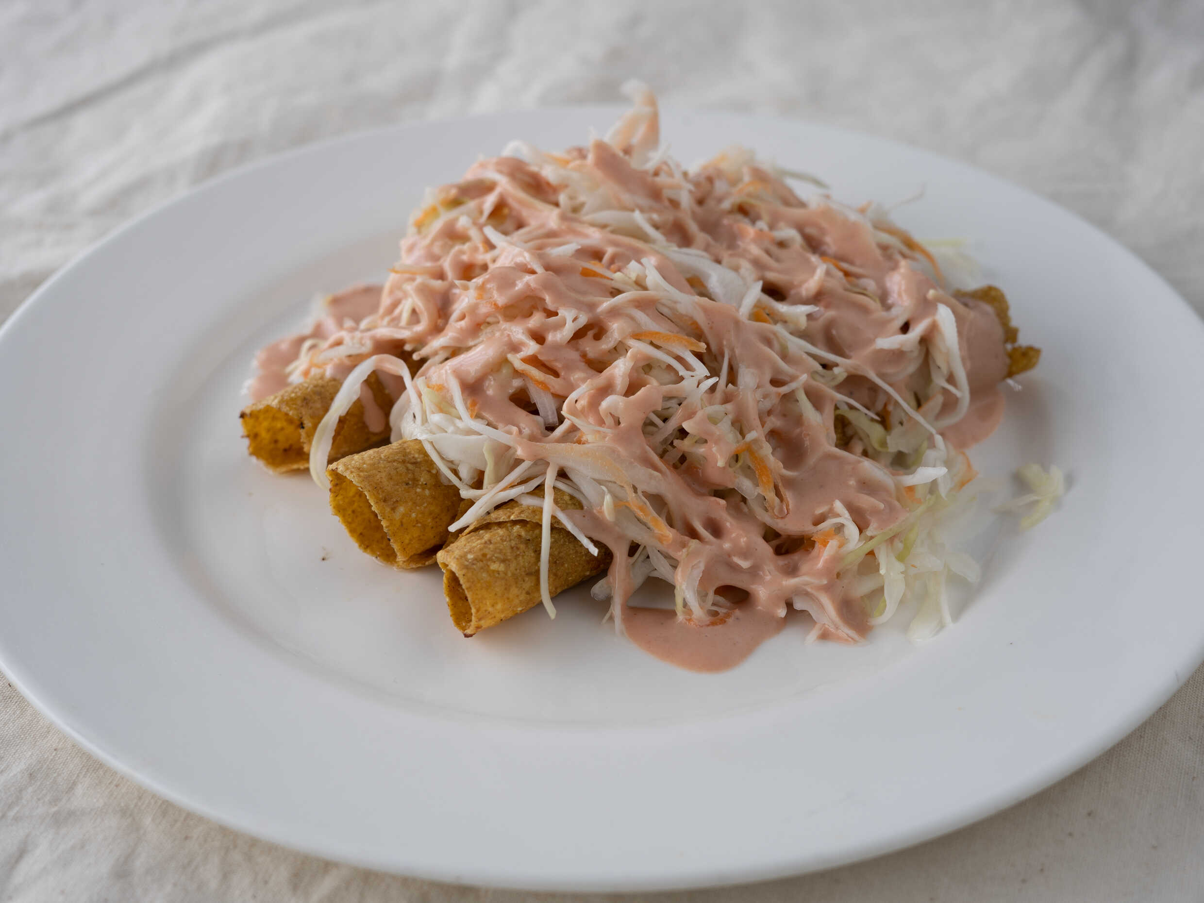 Tres taquitos con relleno a elegir(Pollo, Carne de res o queso), lechuga o repollo a elegir y salsas