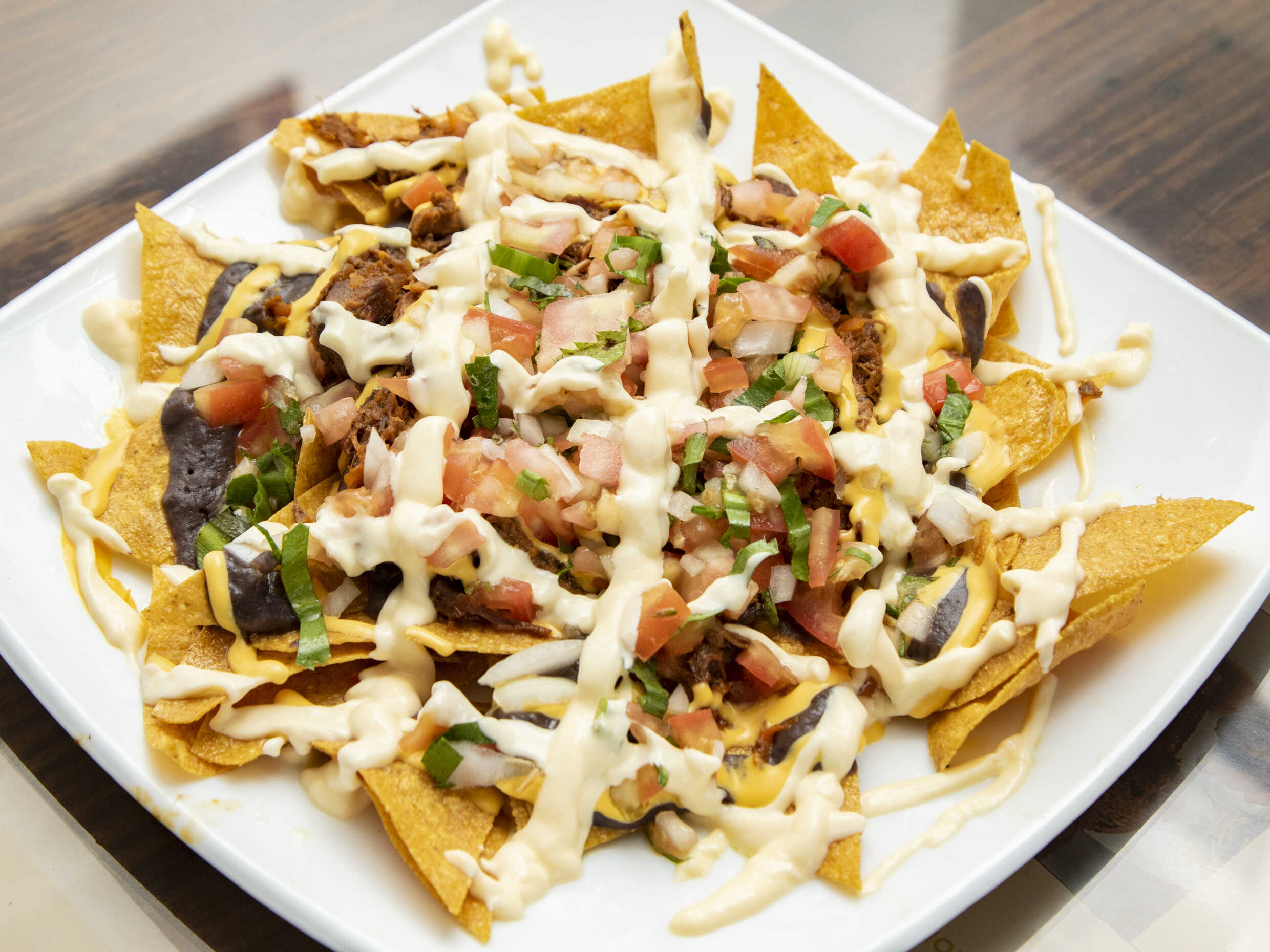 Papas fritas, carne y pollo, frijoles molidos, queso cheddar y chimichurri