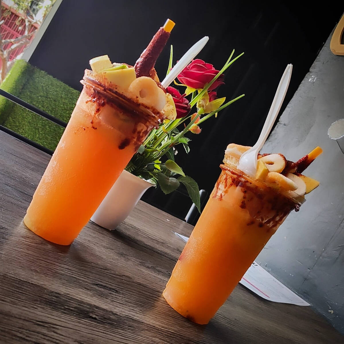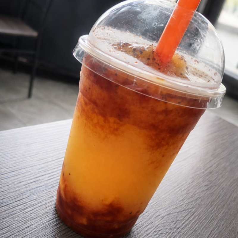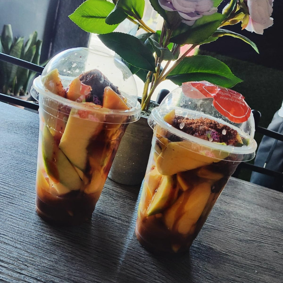 Mango, Tajín ,chamoy, gomitas, limón, salsa Valentina en tipo frappé