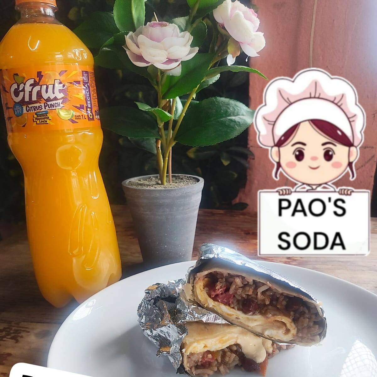 TORTILLA DE HARINA RELLENA DE TORTA DE HUEVO , CON PINTO , SALSHICHON CALDO DE LA CARNE EN SALSA MAS BIG COLA