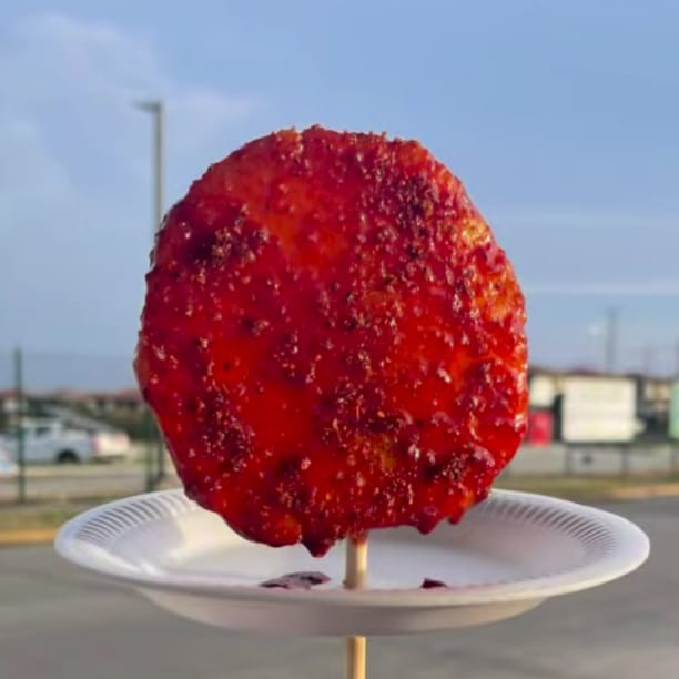 RODAJA DE PIÑA CUBIERTA CON CHAMOY , TAJIN , SALSA VALENTINA Y LIMON