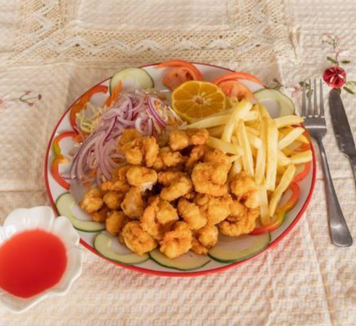 Camarones empanizados acompañados de papas fritas y ensalada repollo, tomate, zanahoria y limón.