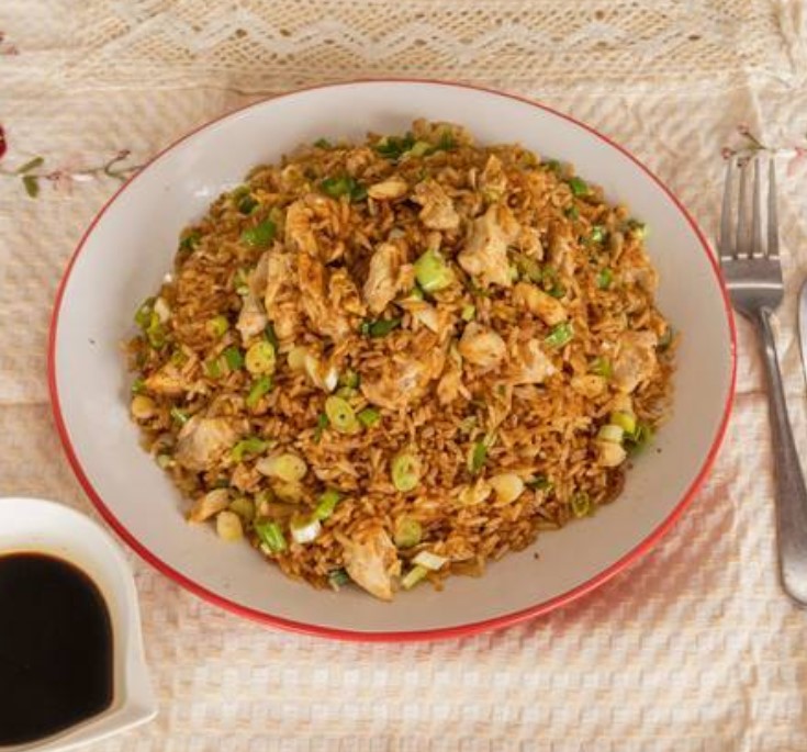 Arroz frito con carne de pollo y especies.