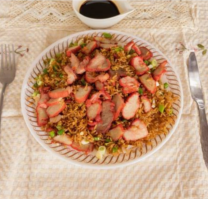 Arroz frito con carne de lechón y especies.