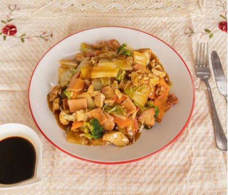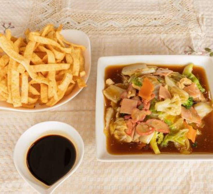 Tiras de pasta de wantan frita con zanahoria, chayote, brócoli, coliflor, mostaza y carne de jamón, pollo y lechón en una salsa especial china.