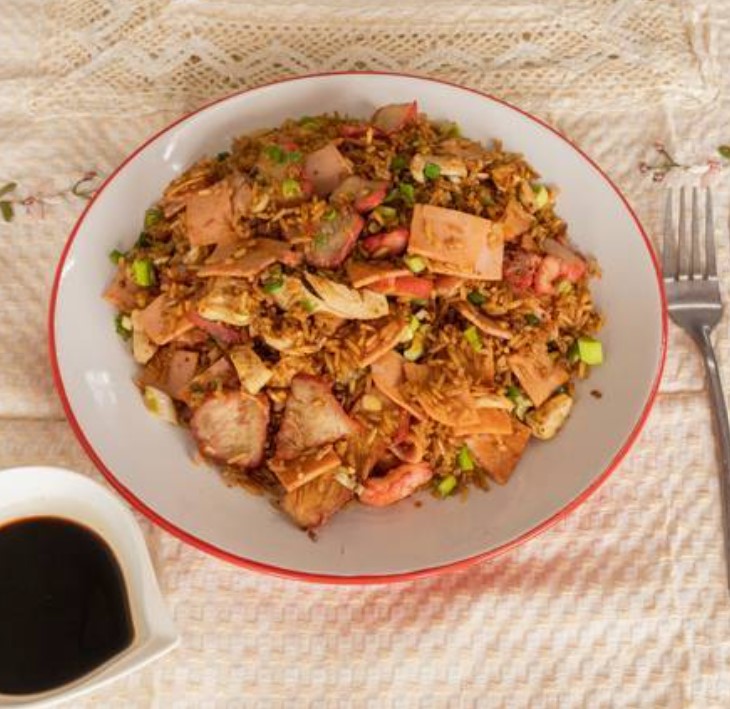 Arroz frito con pollo, lechón, jamón y especies.