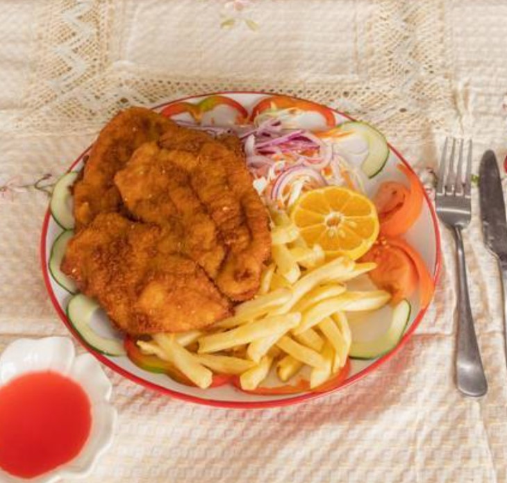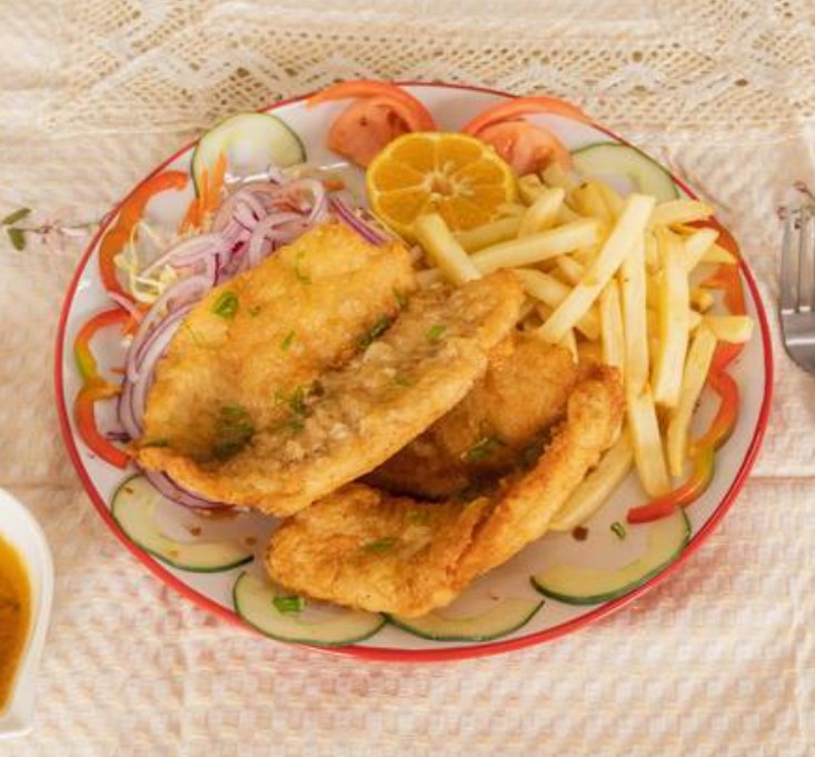 Filete de pescado empanizado acompañado de papas fritas y ensalada de repollo, tomate, zanahoria y limón.
