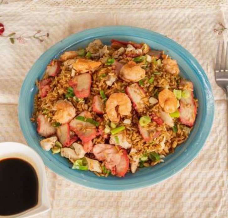 Arroz frito, pollo, lechón, jamón, camarones y especies.