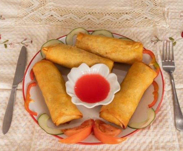 4 Tacos fritos rellenos de repollo, zanahoria, cebolla y jamón.