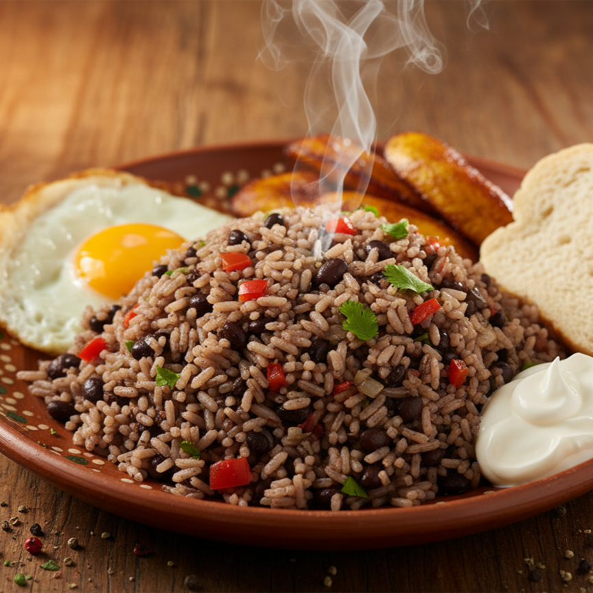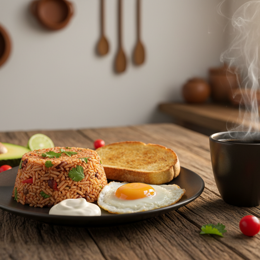 ¡Despierta tus sentidos con el sabor auténtico de Costa Rica! 🇨🇷 Nuestro desayuno especial te trae un Gallo Pinto abundante, 🍳 un huevo a tu elección (frito o revuelto), cremosa natilla y pan recién horneado, acompañado de un vigorizante café negro. ¡El inicio perfecto para tu día! ✨