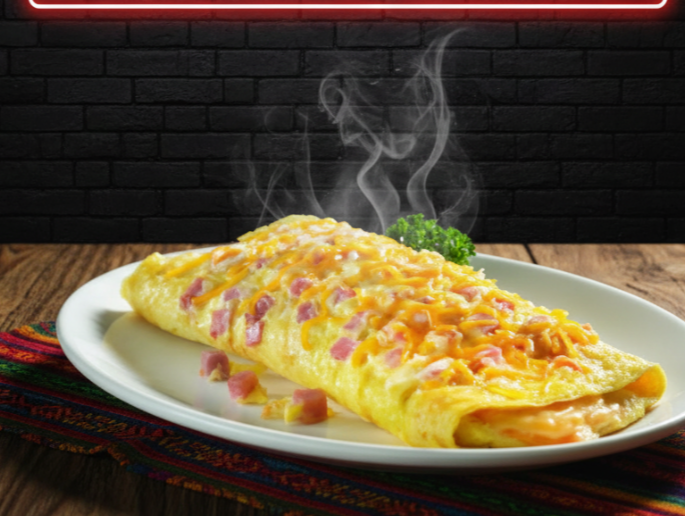 Delicioso omelette de huevo con jamón, queso y olores (cebolla, chile, tomate, cebollino) y dos tajadas de pan.