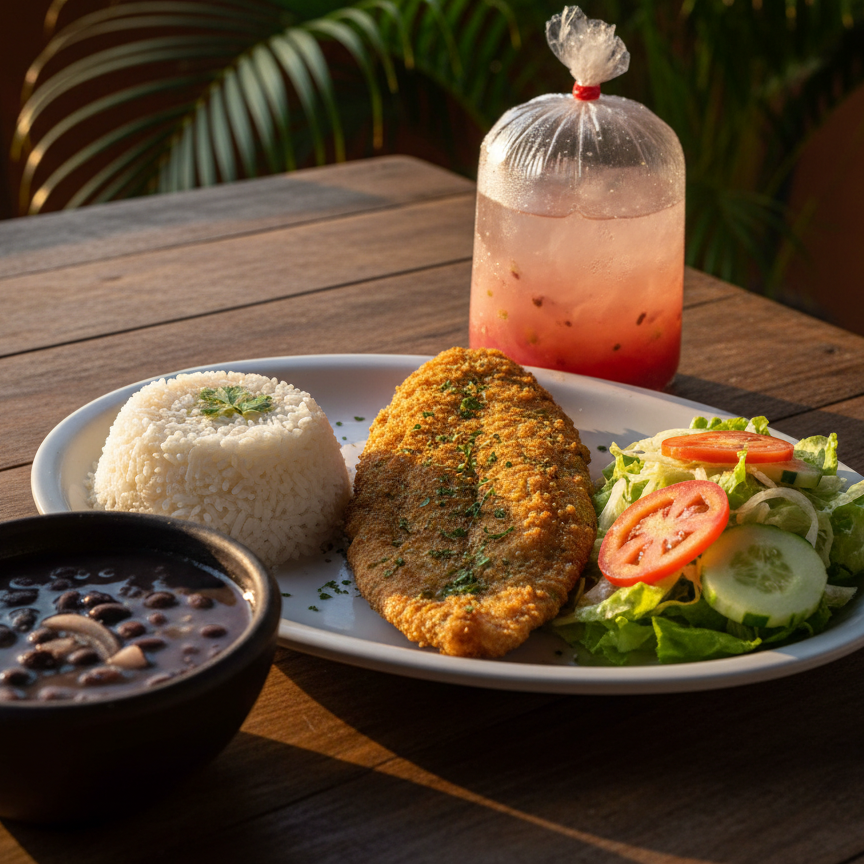 arroz esponjoso, frijoles refritos con sabor casero, una fresca ensalada y una crujiente Proteina a escoger . ¡Todo acompañado de tu refresco favorito para una experiencia completa y deliciosa!
