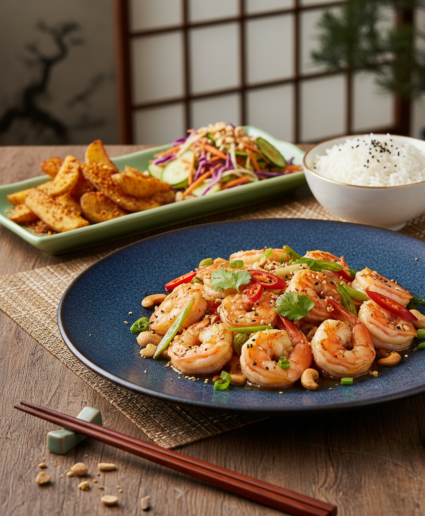 ¡Exquisitos Camarones al Ajillo con un toque asiático! 🍤 Sumérgete en el sabor de camarones jugosos bañados en salsa de ajo y especias, acompañados de arroz blanco perfectamente cocido, papas rústicas crujientes y una ensalada fresca. Una explosión de sabor en cada bocado.