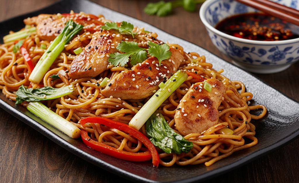 ¡Deléitate con nuestro exquisito Chiu Min con Pollo! Fideos salteados al wok con tiernos trozos de pollo, vegetales frescos y nuestra salsa especial, realzado con ajonjolí tostado y un toque de cilantro. Una explosión de sabor asiático en cada bocado.