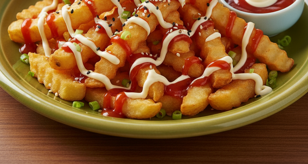 ¡Crujientes Papas Fritas al estilo asiático! 🍟 Doradas a la perfección, bañadas con kétchup, mayonesa cremosa, ajonjolí tostado, cebollín fresco y un toque de katsuobushi. ¡Una explosión de sabor en cada bocado!