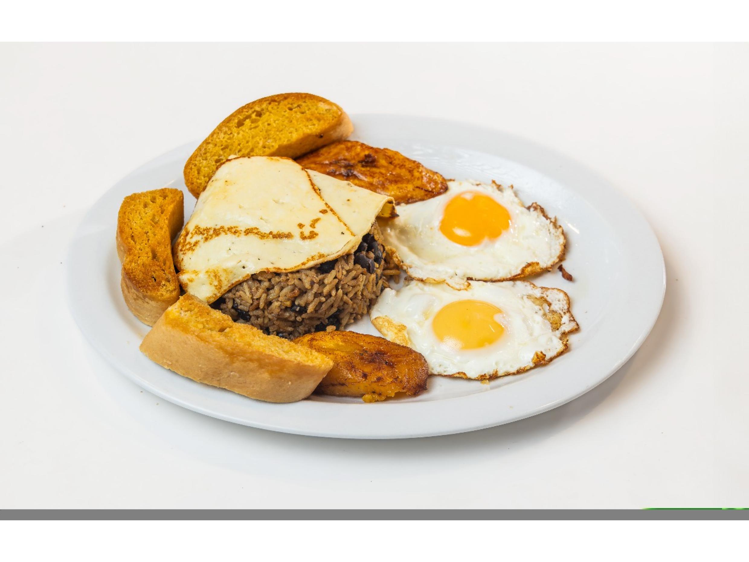 Pinto recién hecho, con dos huevos al gusto, pan y maduros.