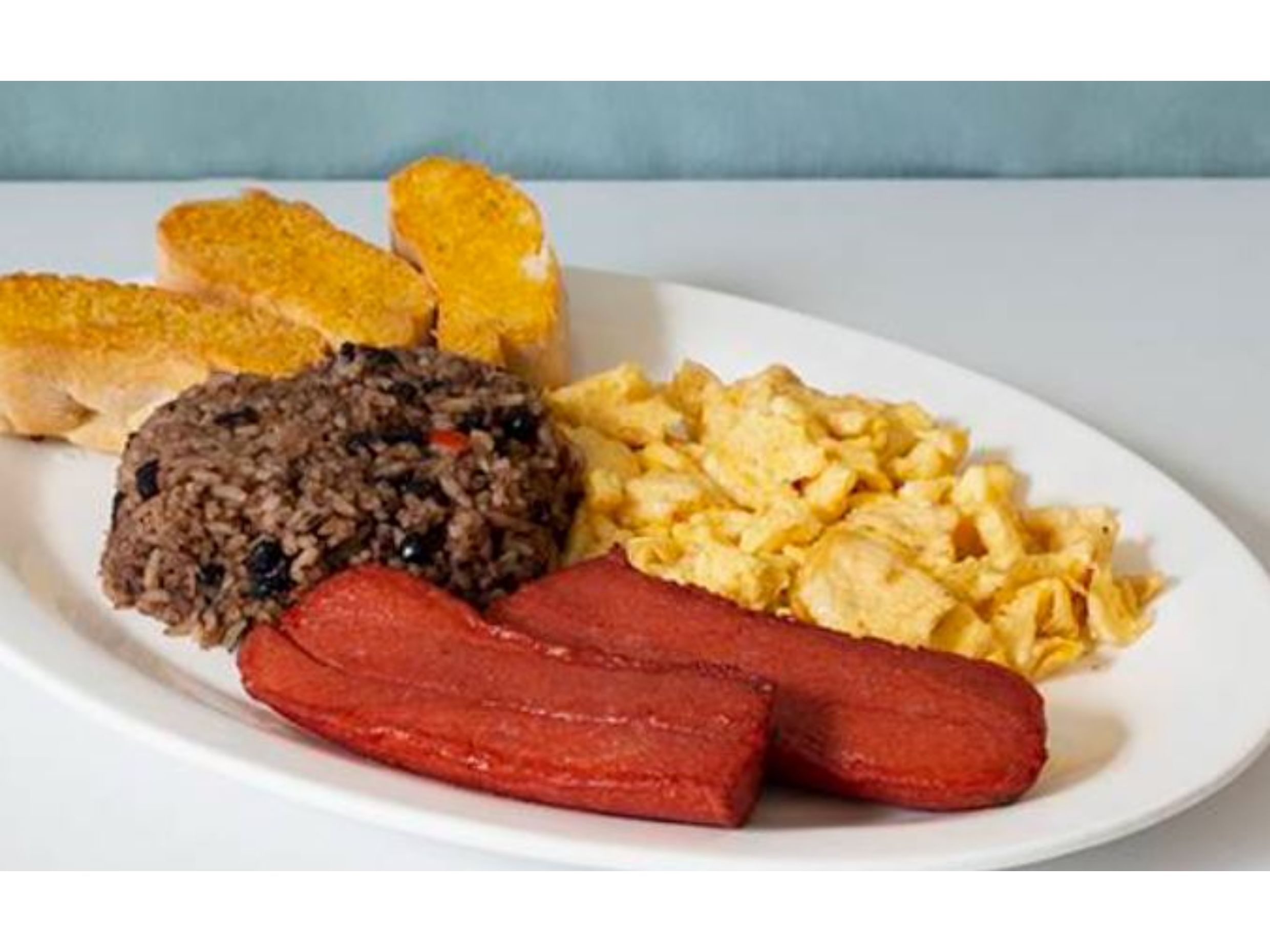 Desayuno completo compuesto por nuestro delicioso gallo pinto, 100 gramos de chorizo, 100 gramos de salchichón, 2 huevos al gusto, pan plátano maduro. Acompañado de una bebida caliente (café negro o con leche, té negro o con leche), jugo de naranja y natilla.