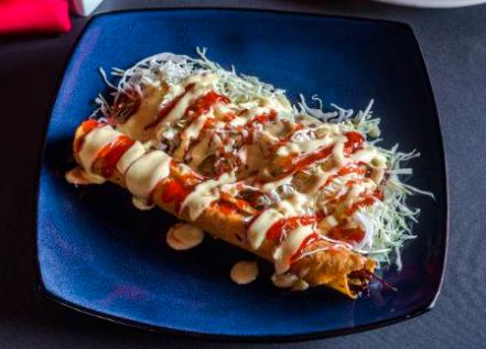 Canelón de carne mechada, envuelto en nuestra pasta de la casa, lleva repollo, salsa de tomate, mayonesa artesanal y una tortilla casera.