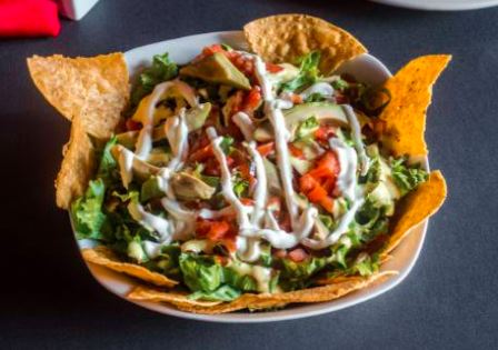 Tortillas tostadas con carne mechada o pollo mechado, frijoles molidos, lechuga, salsa de tomate, mayonesa artesanal, tomate picado, aguacate y natilla.
