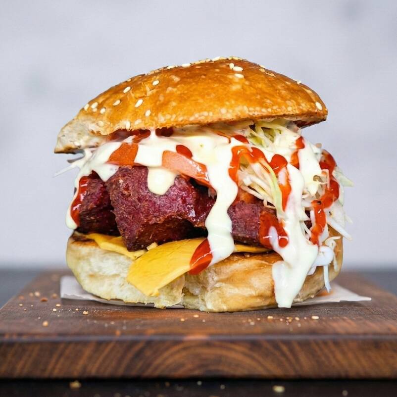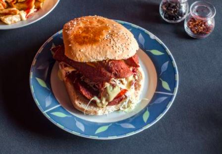 Hamburguesa de salchichón, salsa a escoger, vegetal deseado y rebanada de tomate