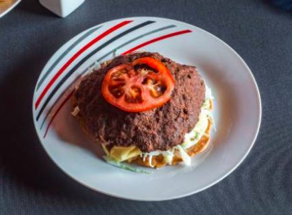Torta casera con repollo, salsa de tomate, mayonesa artesanal y rebanada de tomate