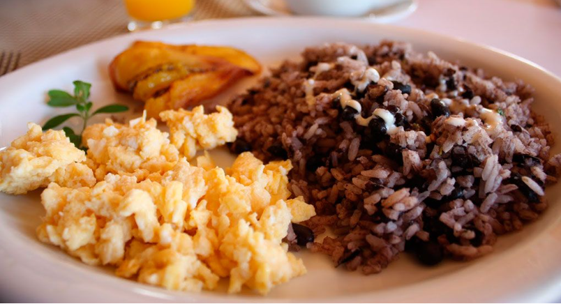 Gallo pinto, tortilla de harina, maduro, huevo y jamon