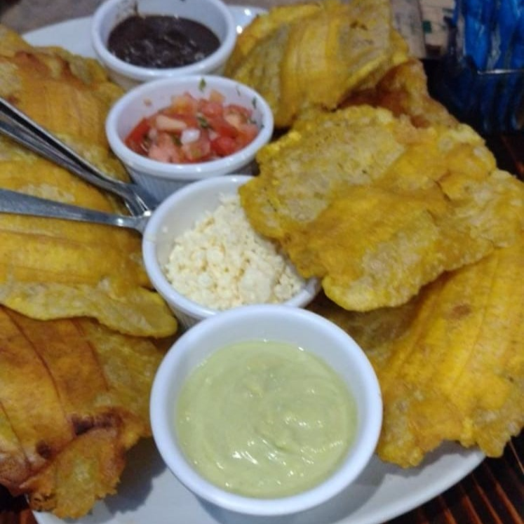 Incluye todo tipo de mariscos (camarón, almeja, pescado, jaiba, pulpo, calamar). Acompañado de papas tostadas y ensalada.