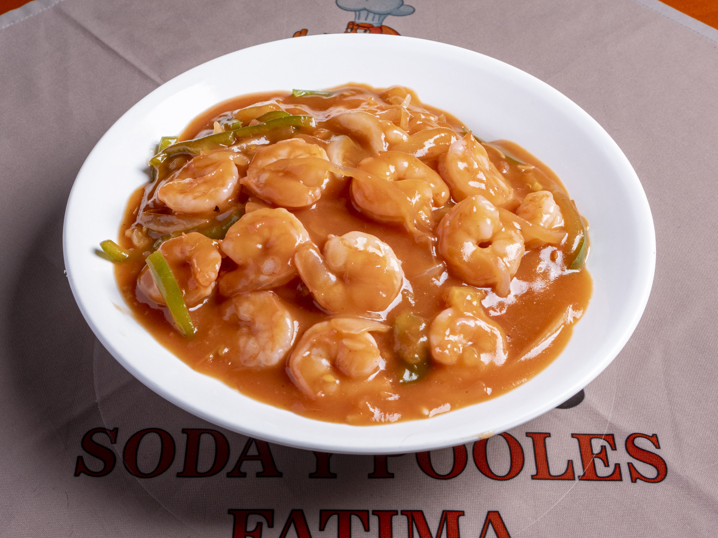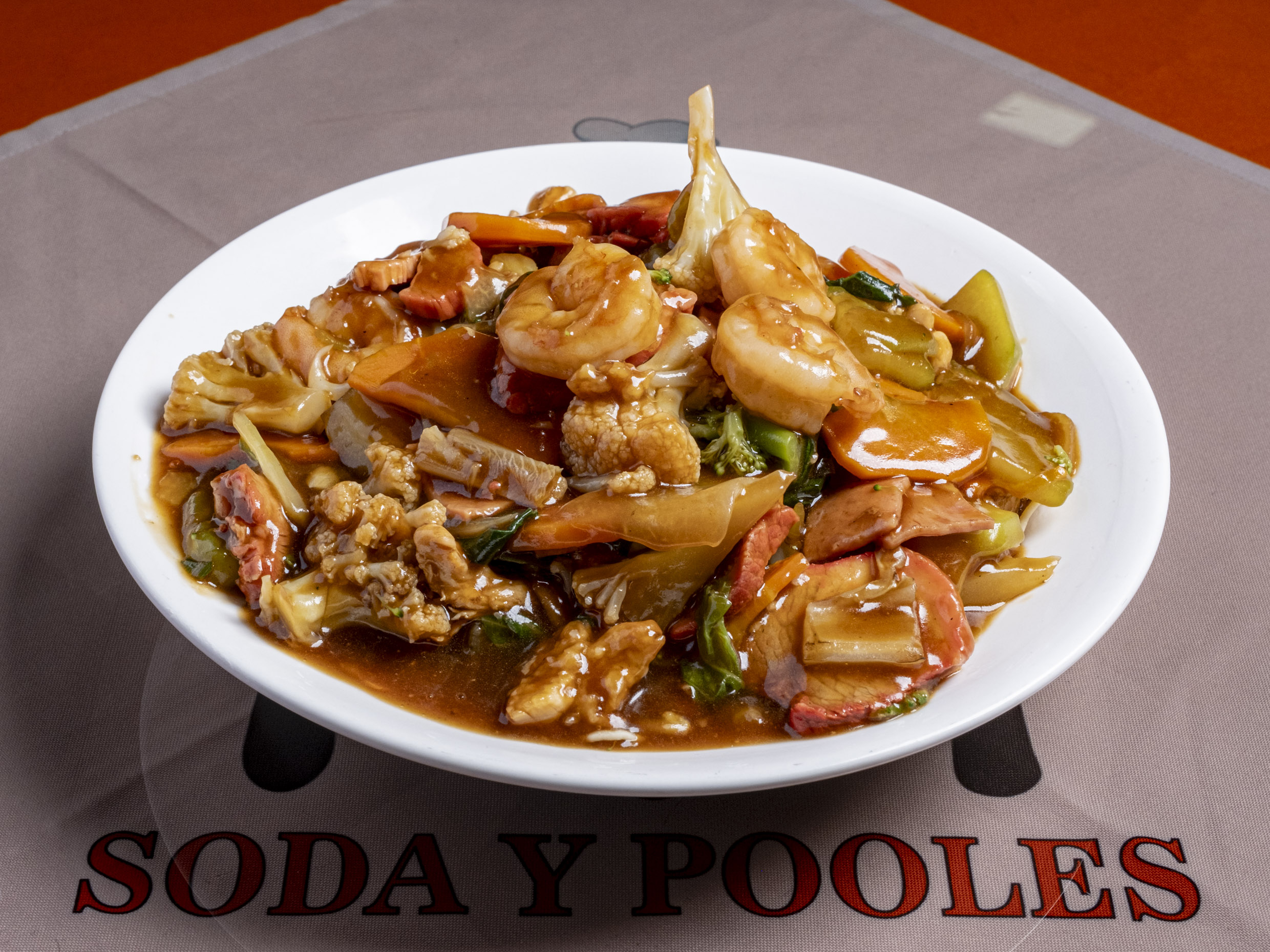 Con arroz blanco, pollo, cerdo, res y camarón.