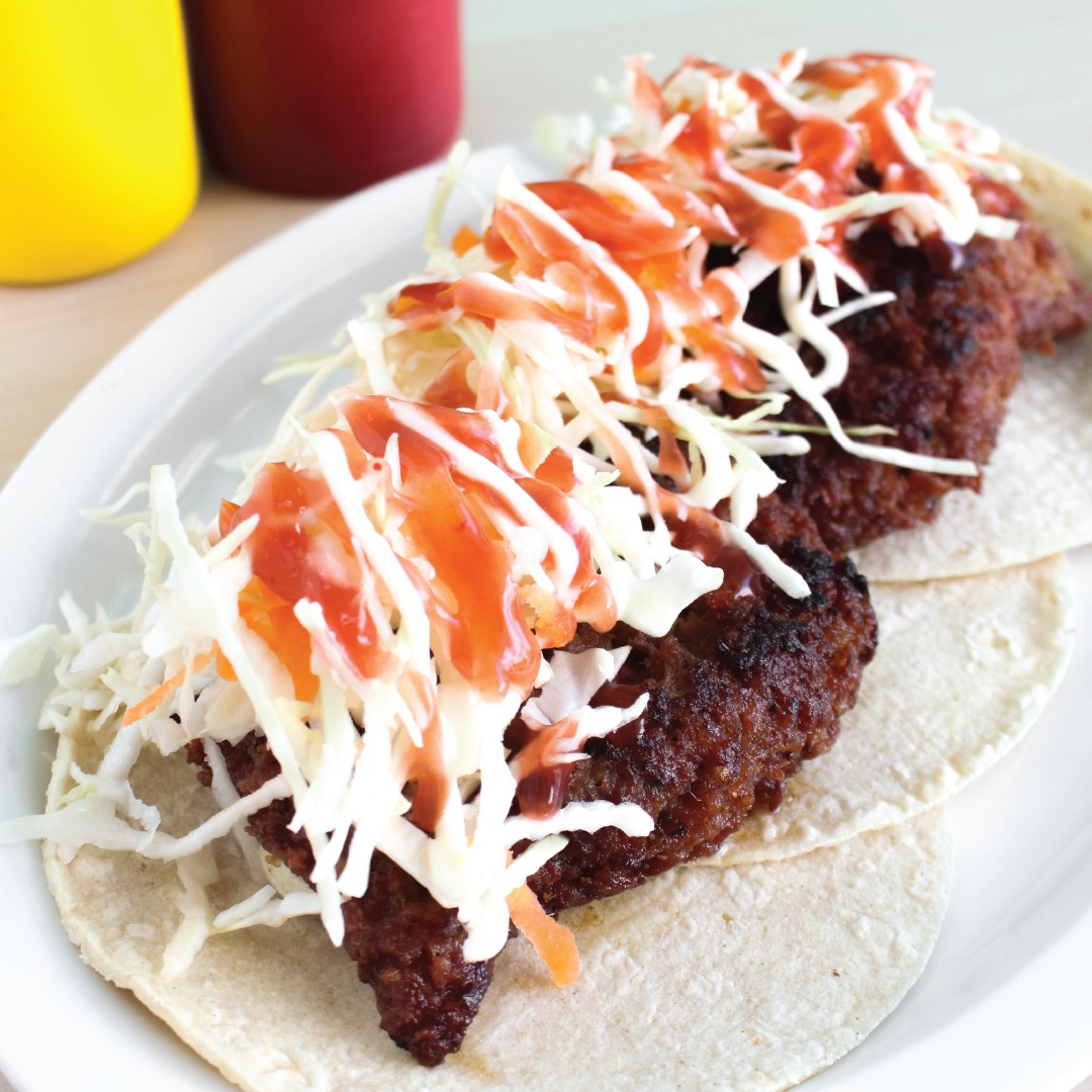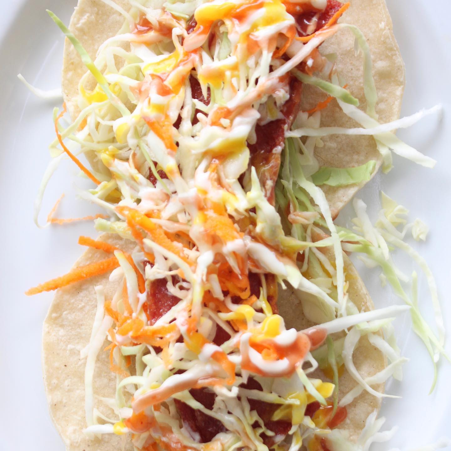 Arreglado con ensalada de repollo y salsas.