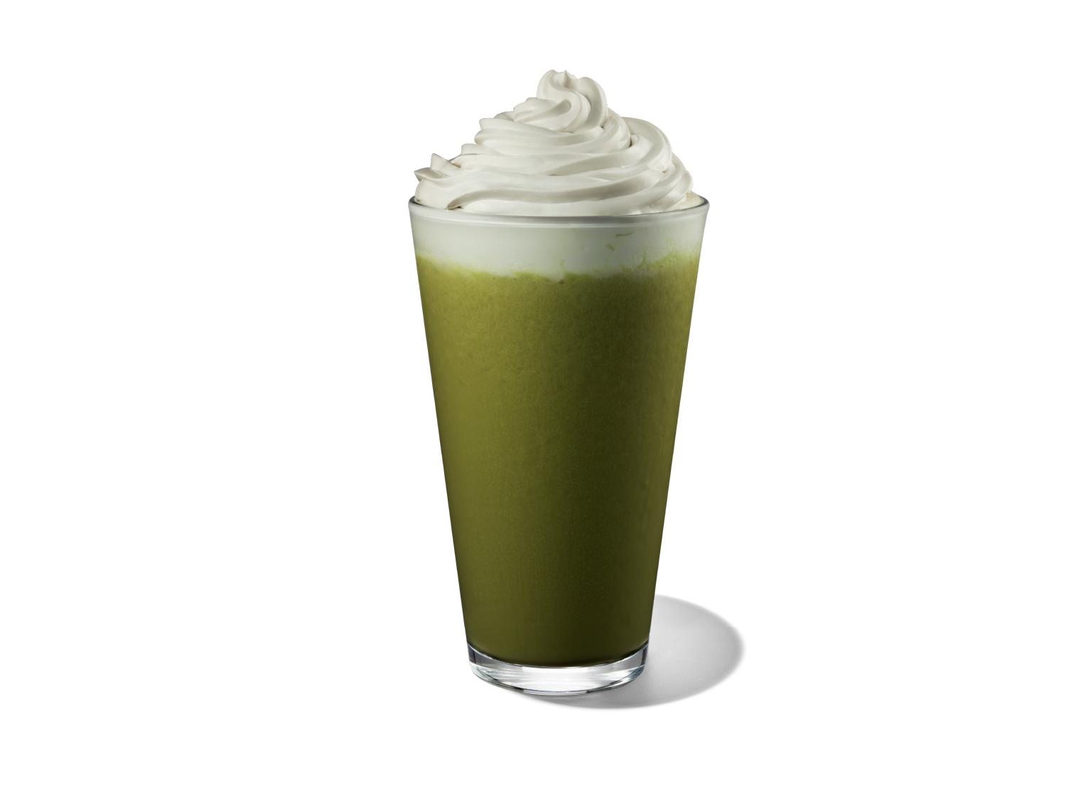 Una bebida mezclada preparada con Frappuccino® de pistacho, complementada con círculos de topping de chocolate en el vaso. Se finaliza con crema batida y un espiral de salsa mocha, ofreciendo una experiencia cremosa, equilibrada y llena de sabor.