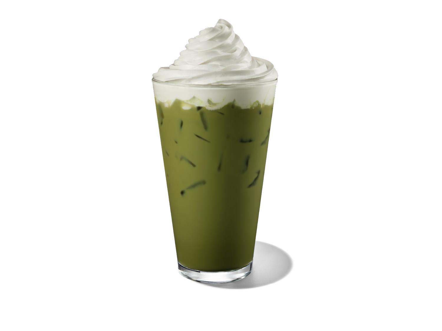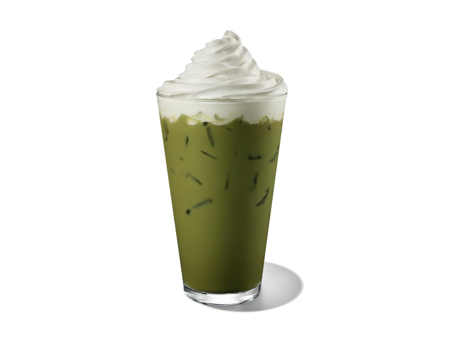 Una bebida fría preparada con latte de pistacho, complementada con círculos de topping de chocolate en el vaso. Se finaliza con crema batida y un espiral de salsa mocha, ofreciendo una experiencia refrescante, cremosa y llena de sabor.