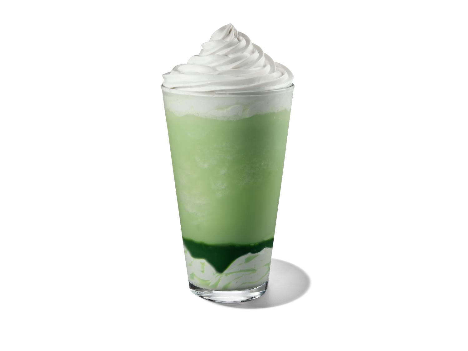 Una bebida sin café, preparada con Frappuccino® Cream de pistacho, complementada con círculos de topping de chocolate en el vaso. Se finaliza con crema batida y un espiral de topping de mocha, ofreciendo una experiencia cremosa, equilibrada y llena de sabor.