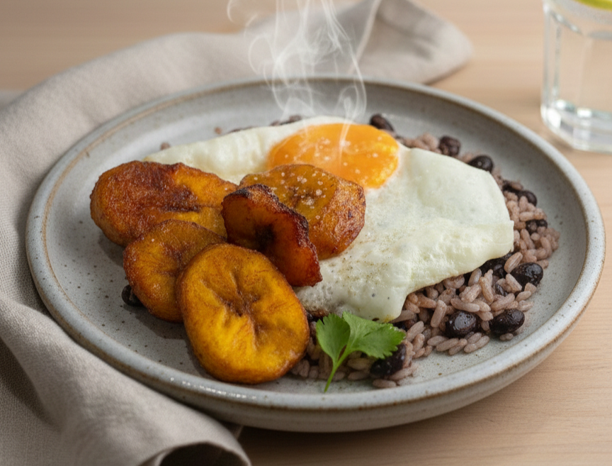 Pinto con huevo, plátano maduro y natilla