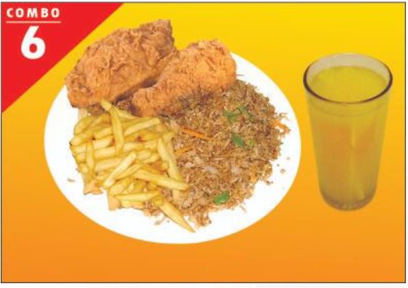 Incluye, arroz frito, dos piezas de pollo frito y refresco natural.