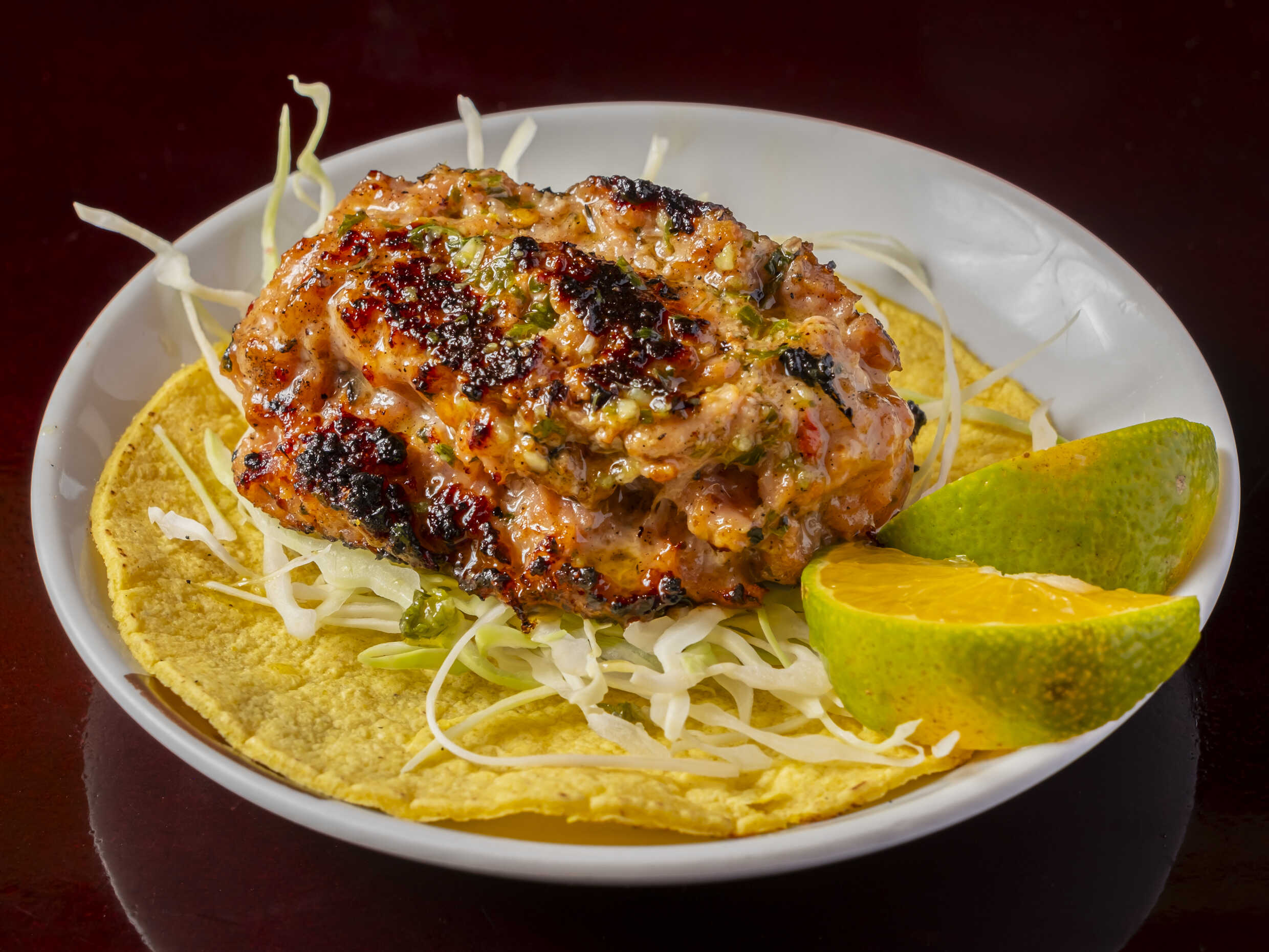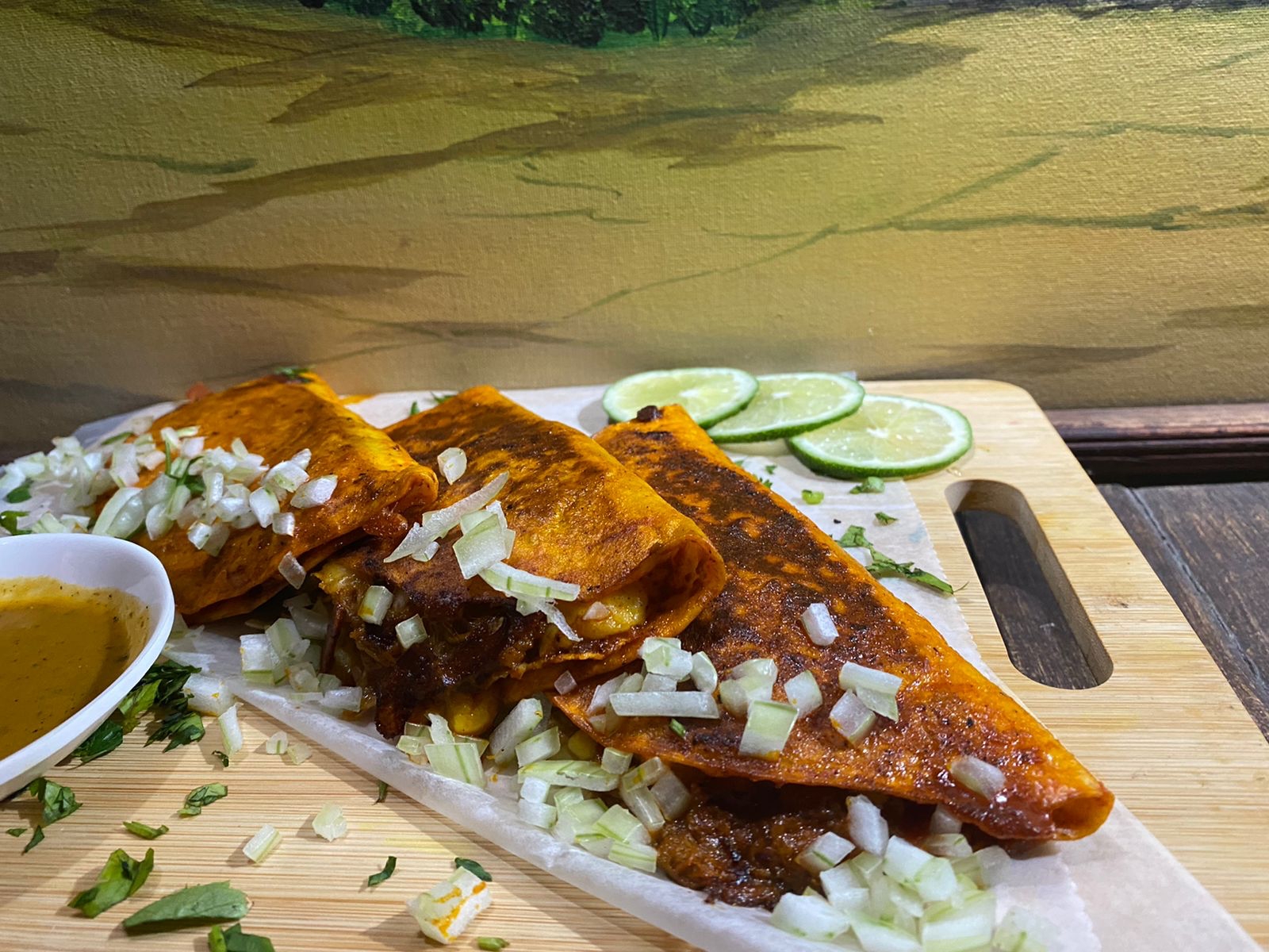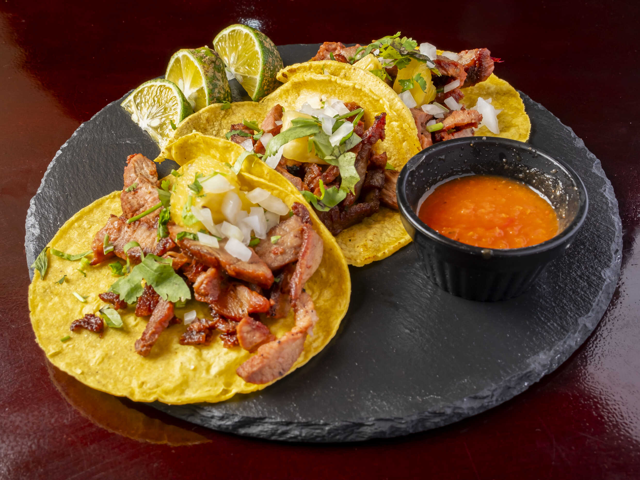 Tortillas de harina rellenas con carne al pastor, cebolla, culantro y piña. Acompañado de pico de gallo, frijoles molidos y tortillas tostadas.