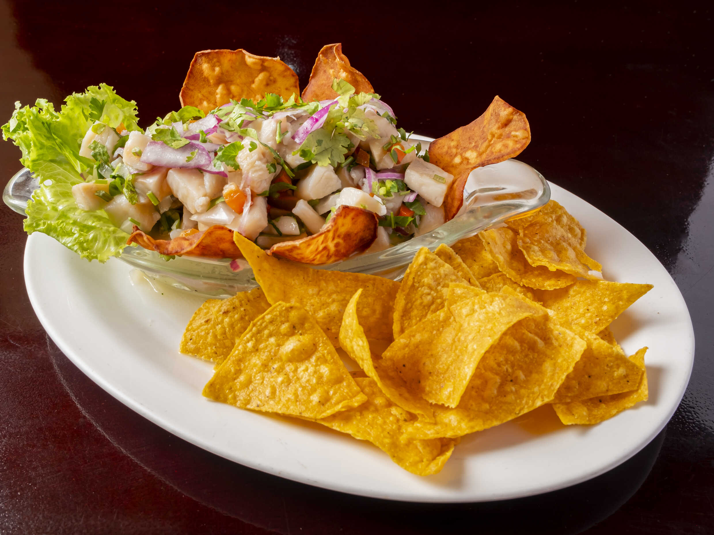 Pescado, camarones frescos, limón natural, cebolla en renúa, culantro, chile dulce acompañado con tortillas tostadas.