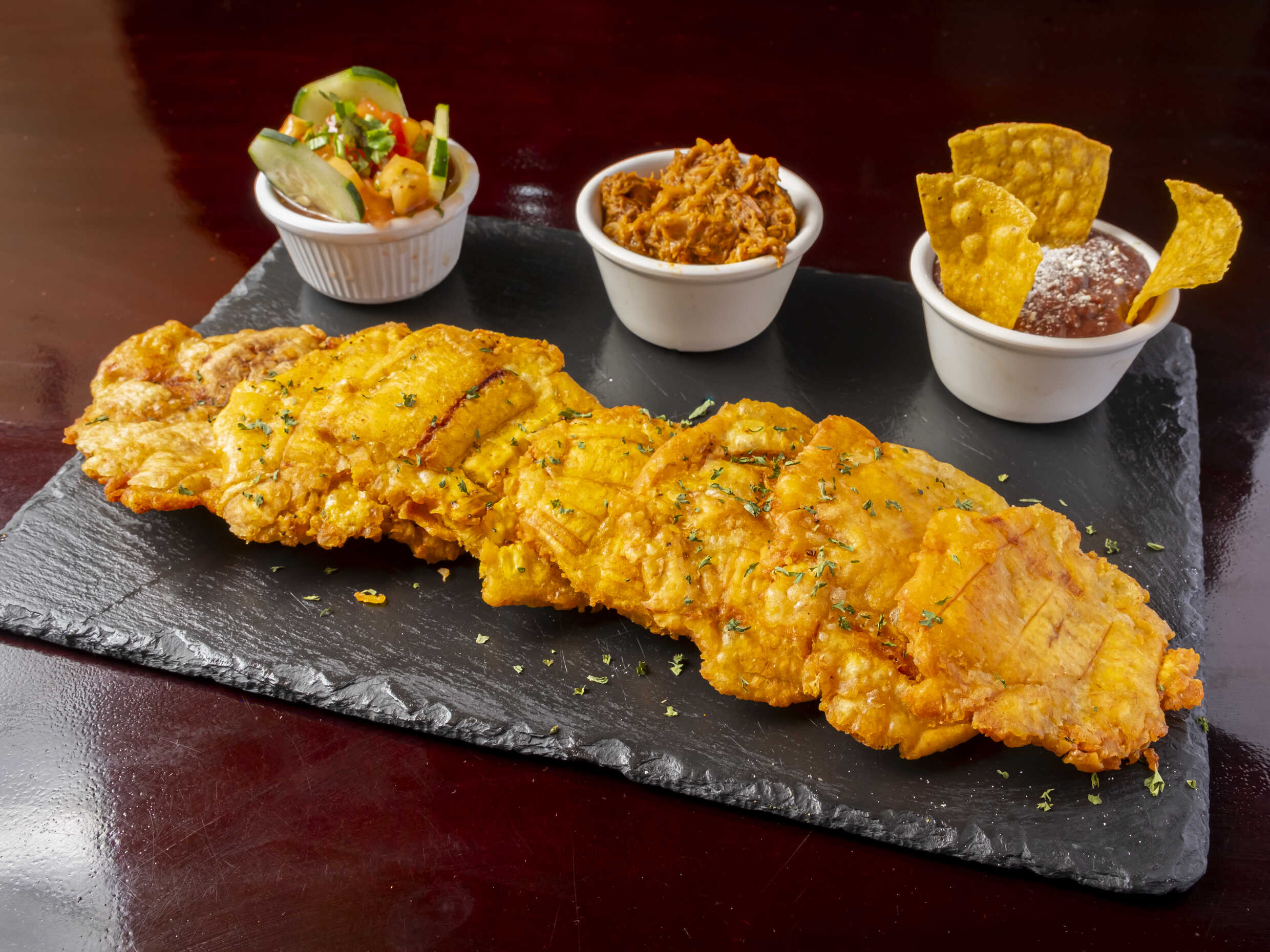 Ocho unidades de patacones acompañados de pico de gallo, frijoles molidos, guacamole y carne mechada.