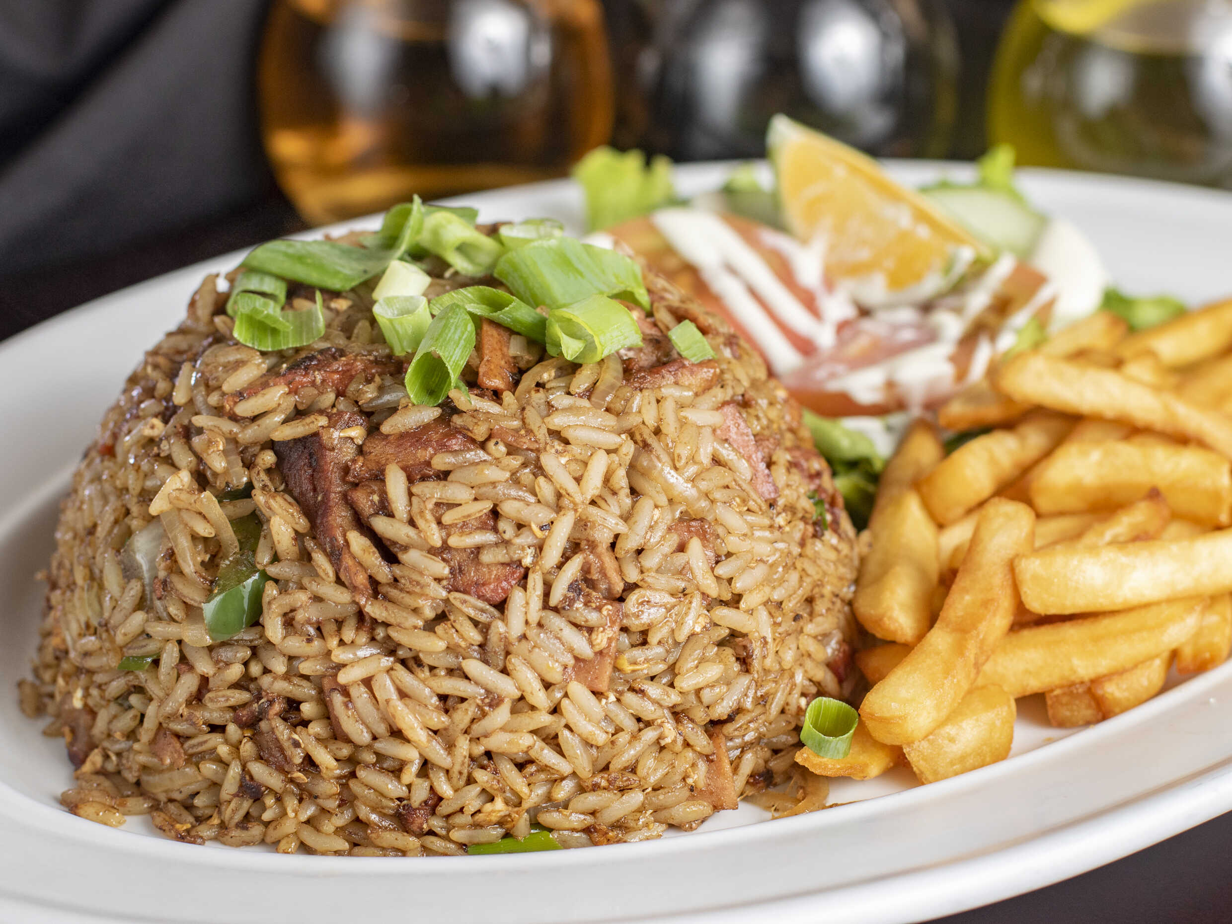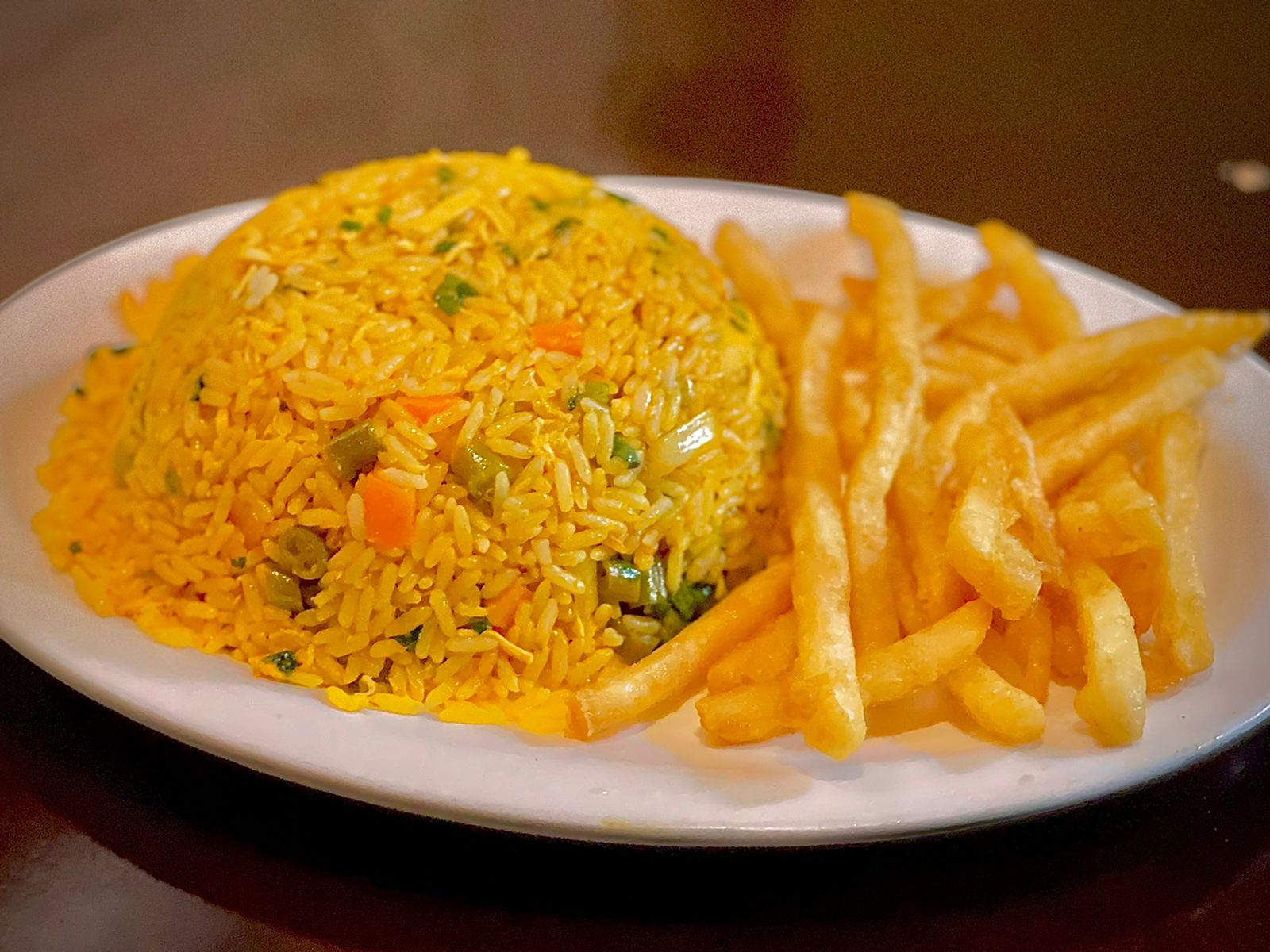 Mix de carnes, vegetales y huevo en salsa china, acompañado de papas fritas y ensalada varía según el día.