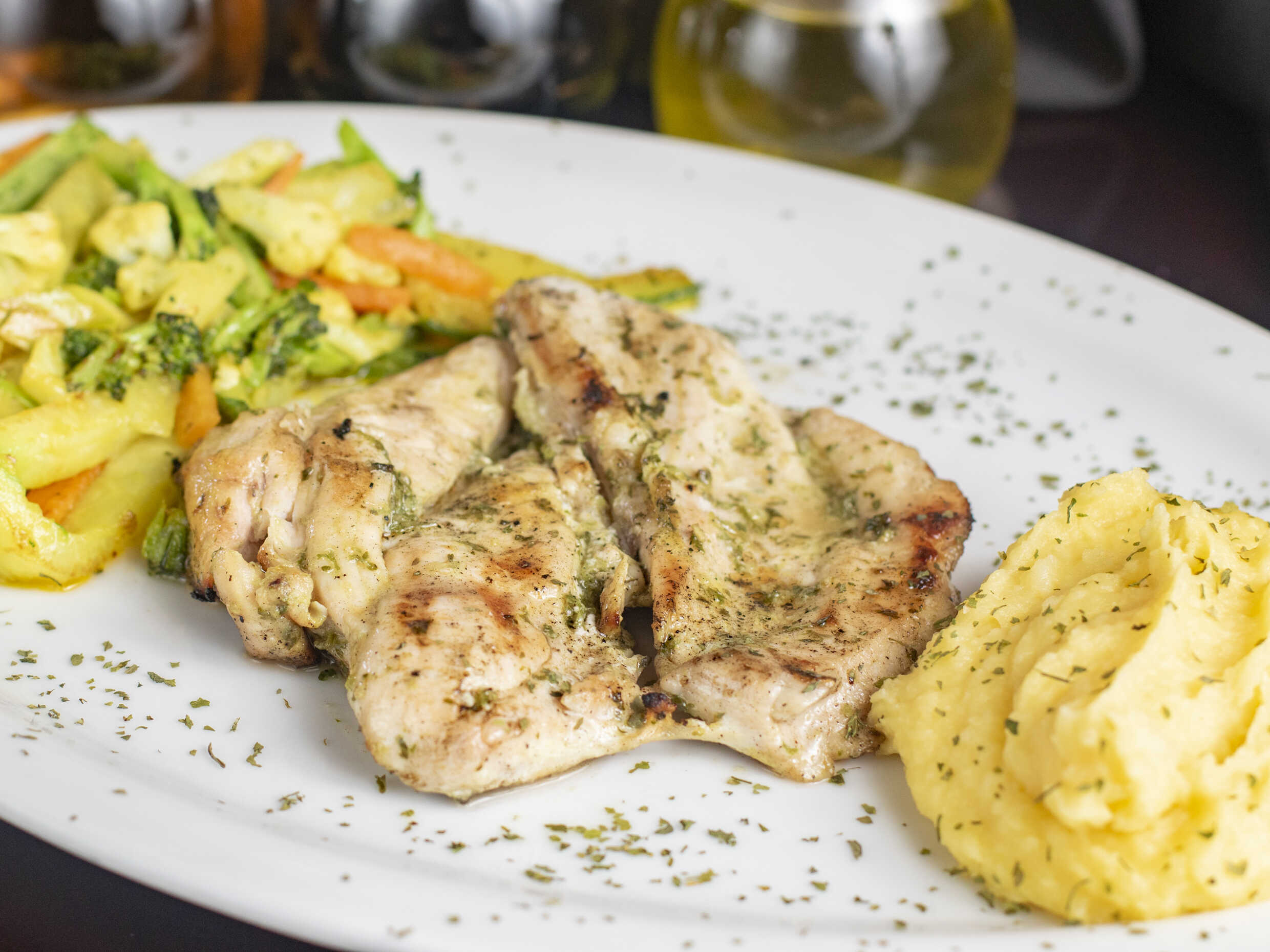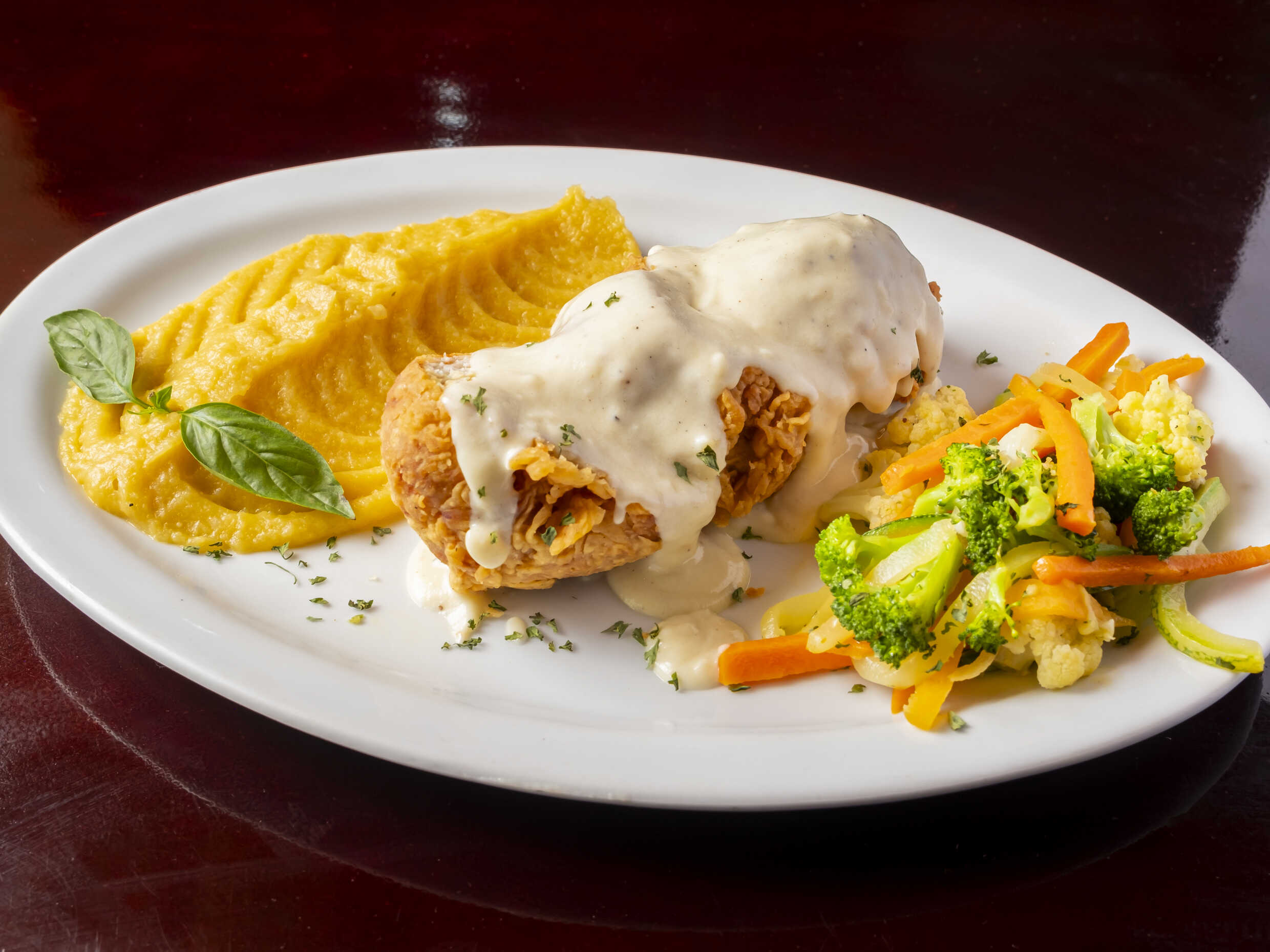 Pechuga de pollo empanizada rellena de mozzarella y jamón de pavo bañado en salsa blanca.