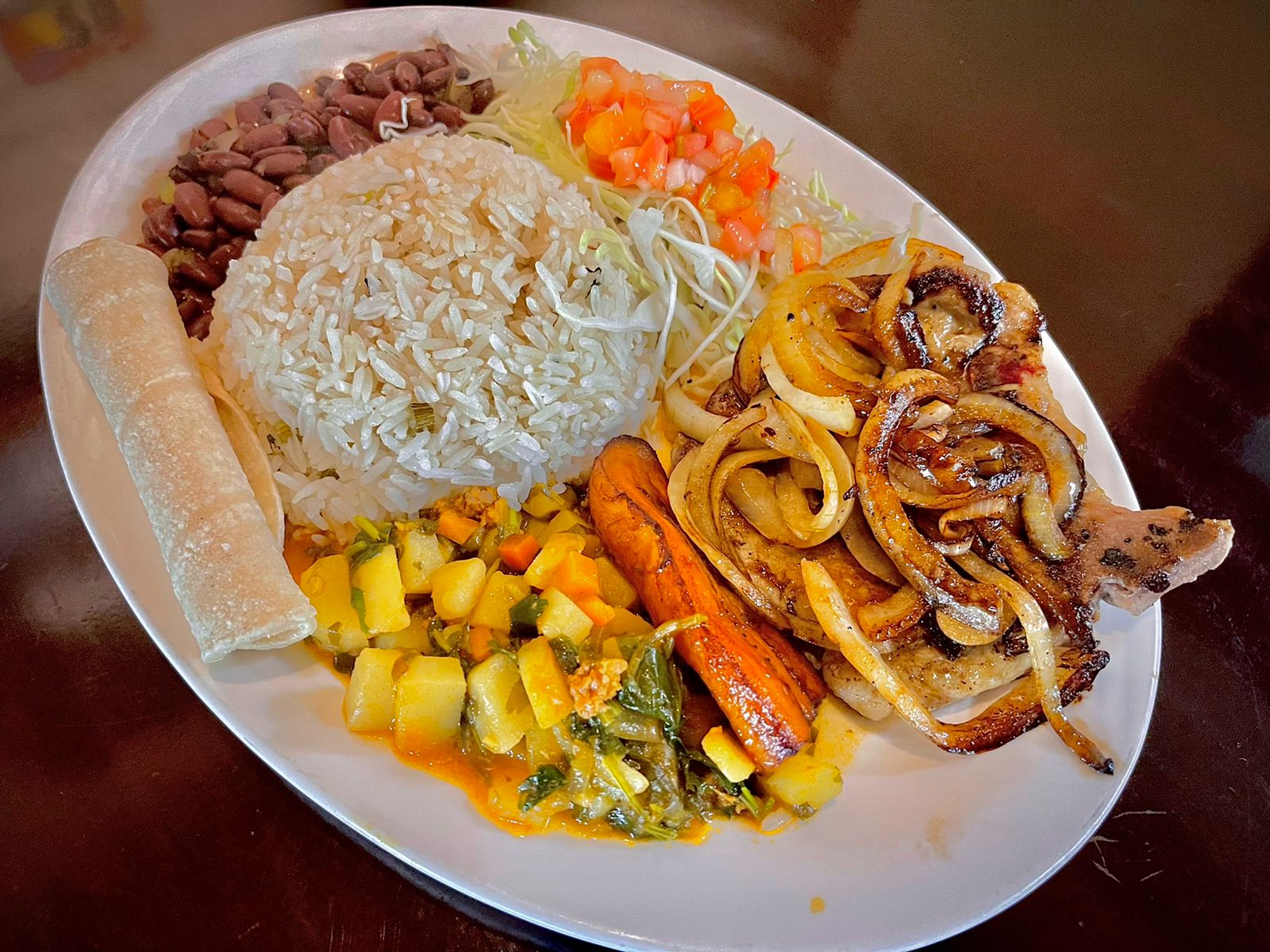 Pollo y vegetales al estilo casero acompañado de ensalada que varía según el día y papas fritas.