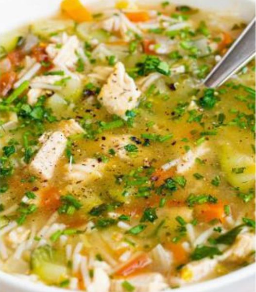 Fondo de res o pollo acompañado con verduras y especies naturales con arroz y tortillas tostadas.