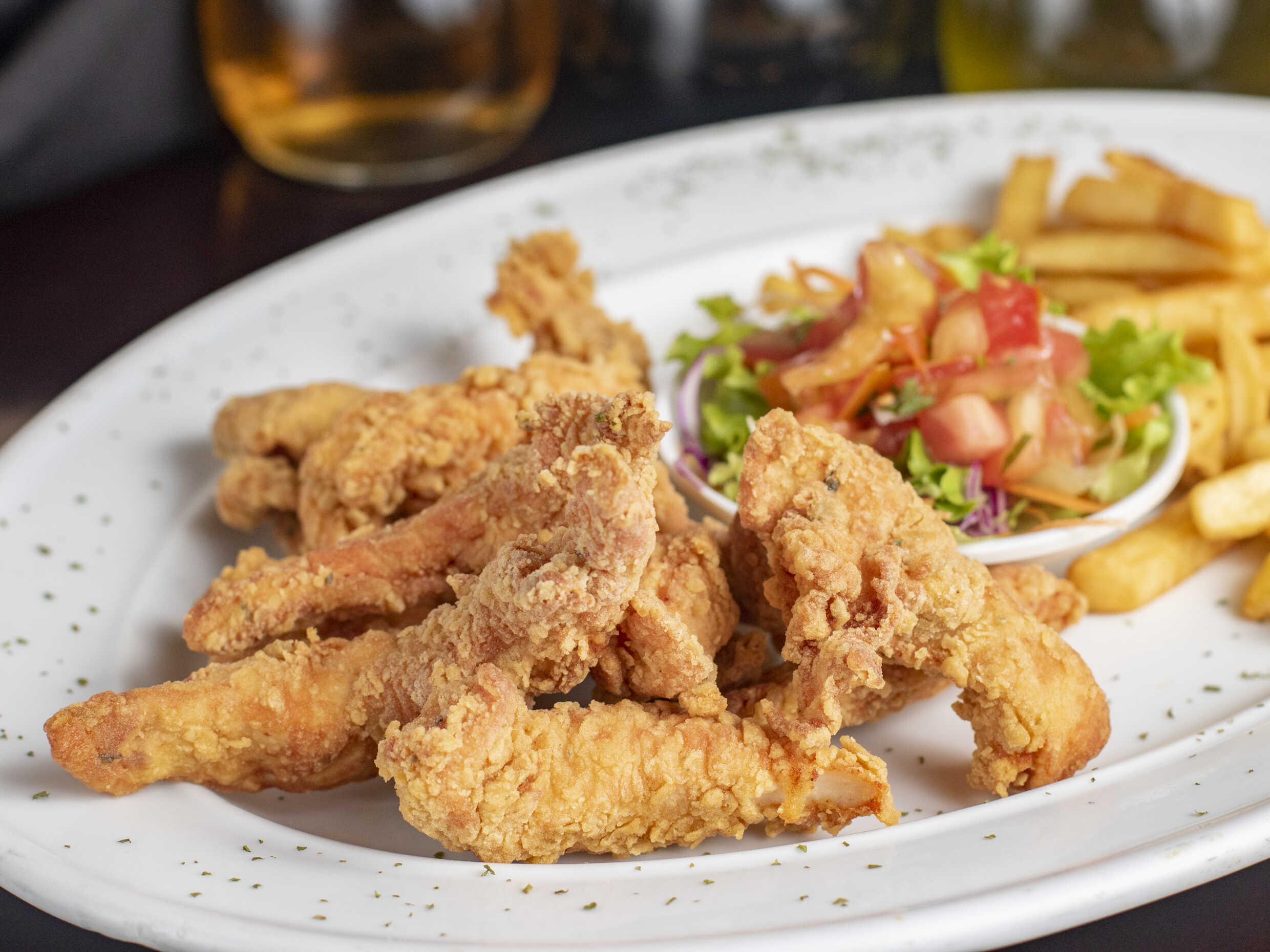 Tiras de pescado empanizado, acompañado con papas fritas.