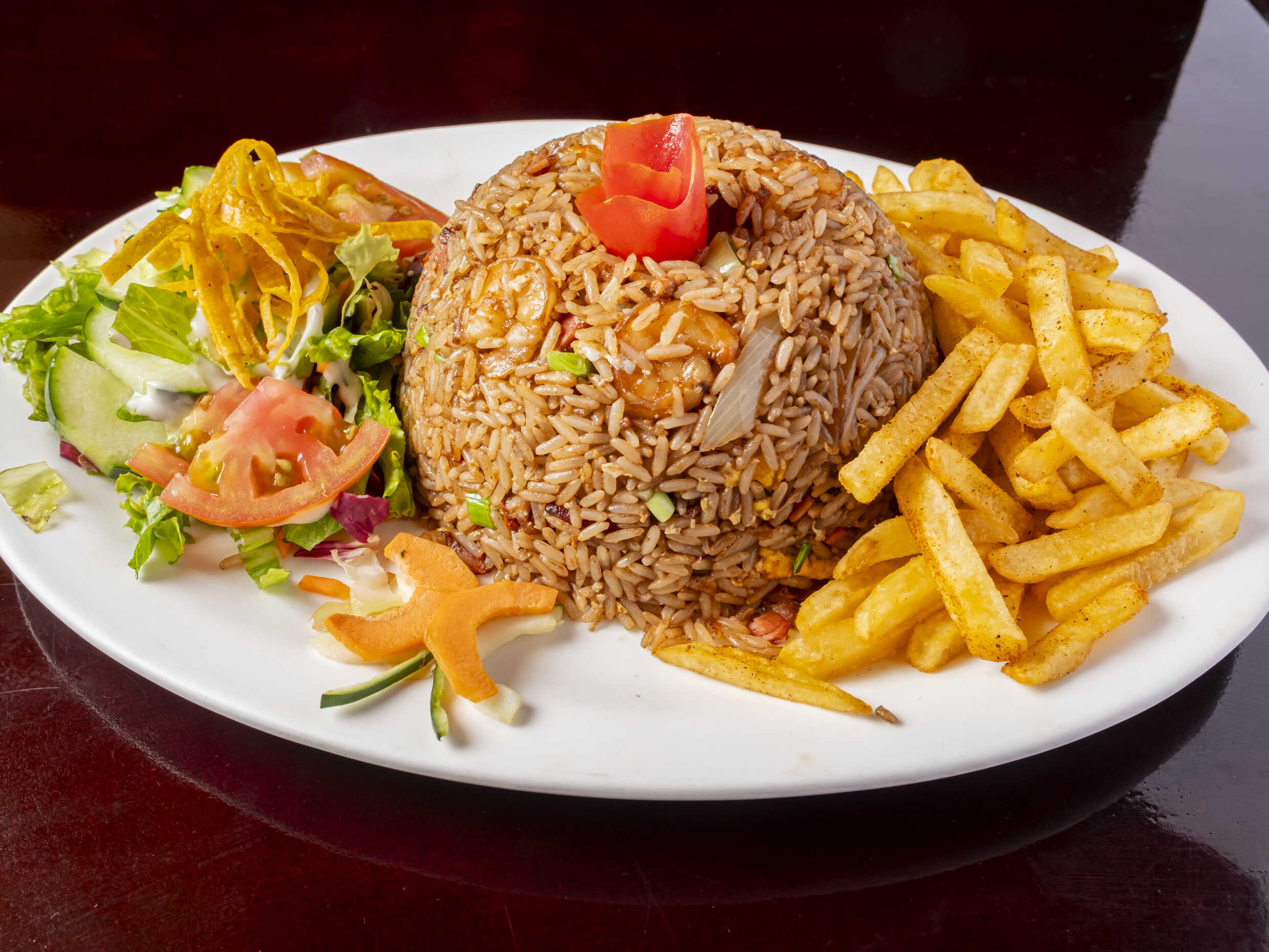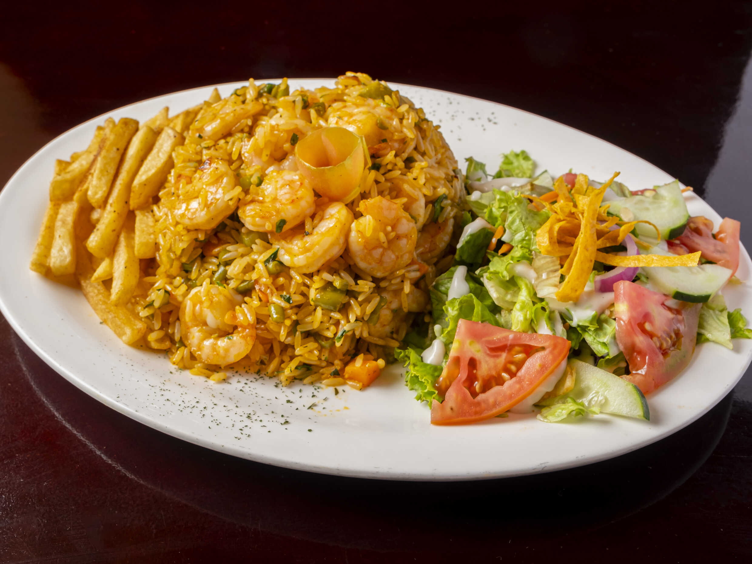 Camarones frescos y vegetales acompañados con ensalada que varía según el día y papas fritas.