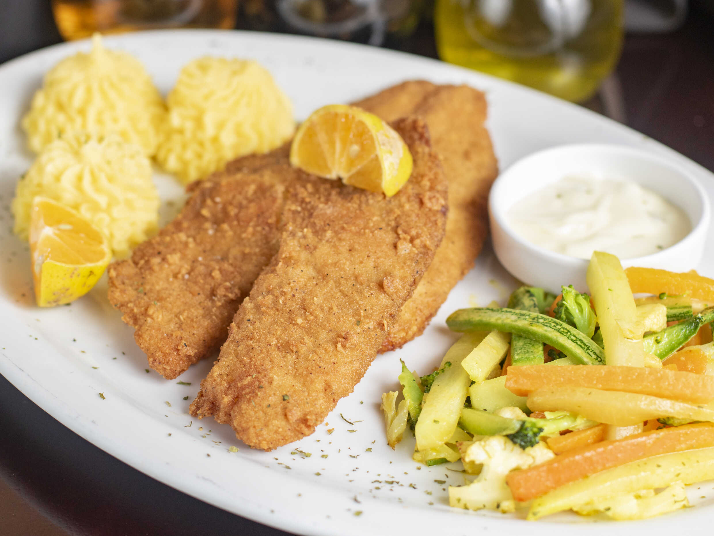 1 filete de Pescado a eleccion (empanizado, ajillo, plancha o mantequilla) , 2 guarniciones a eleccion ( Vegetales Arroz entre otros ) ensalada del dia , papa frita (180 gramos ) y salsa tartara