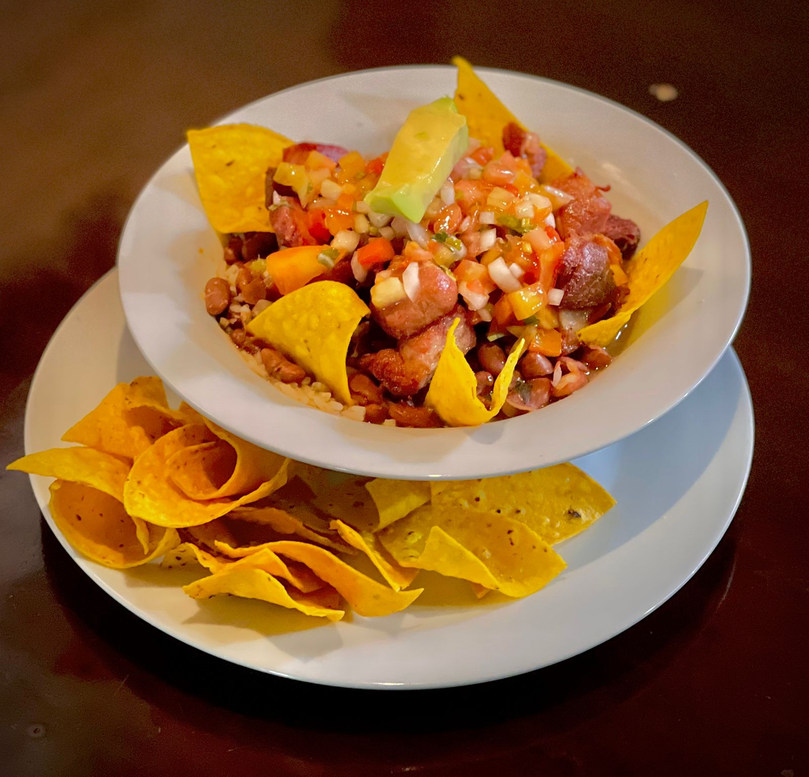 Totopos con carne al pastror, cebolla, Culantro, Piña, natilla, queso cheddar y guacamole.