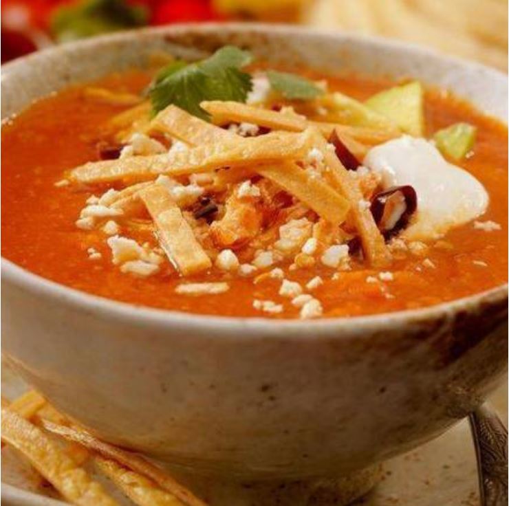 Sopa de tomate aderezada con especies finas estilo mexicana,pollo, acompañada con aguacate, queso mozzarella y tortillas tostadas.