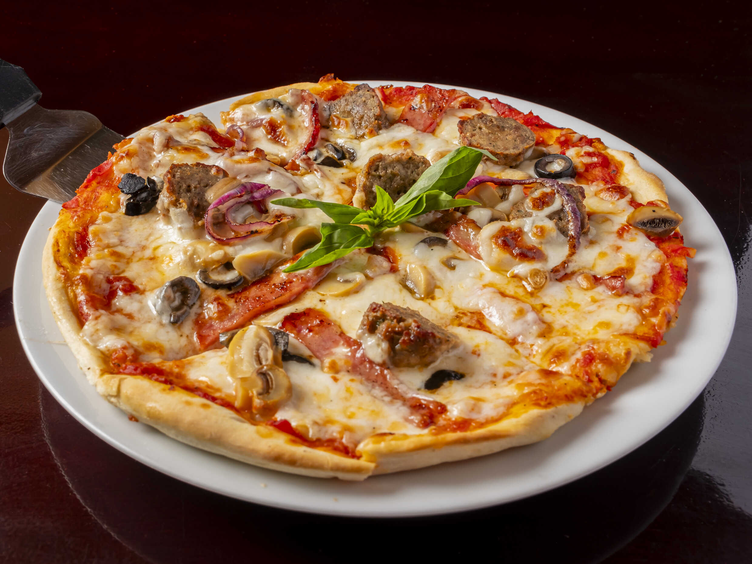 Queso mozzarella, tomate, tocineta, pepperoni, carne, hongos, cebolla y chile dulce.
