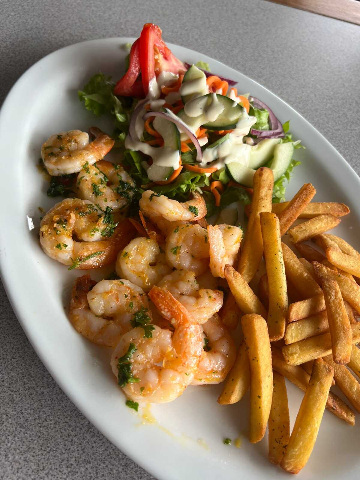 Camarones frescos (300 g) y vegetales acompañado de papas fritas y ensalada que varía según el día (tamaño único).