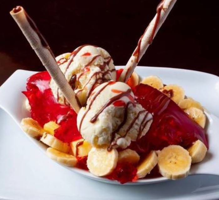Mix de frutas (papaya, sandia, banano, piña) acompañado de helados, crema chantillí y barquillos.